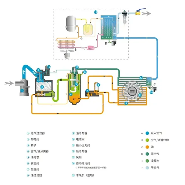 1. مرحله راه اندازی: هنگامی که دکمه پاور فشار داده می شود، سیستم کنترل الکترونیکی به طور خودکار سیستم روغن کاری و سیستم آب خنک کننده کمپرسور هوا را راه اندازی می کند. همزمان دریچه ورودی باز می شود و هوا به داخل واحد اصلی وارد می شود.