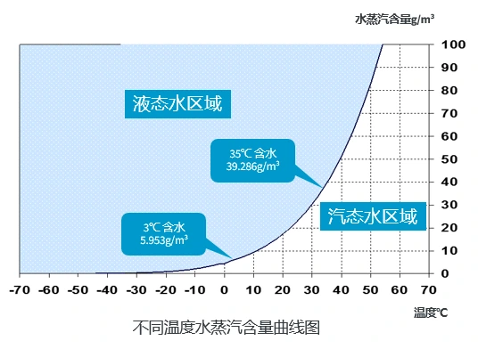 شکل نشان می دهد که هوا در دماهای مختلف مقادیر متفاوتی بخار آب را در خود نگه می دارد. هوا خنک می شود و سطح بخار آب آن نیز پایین می آید. منحنی دارای نقاطی است که سطوح بخار آب اشباع را مشخص می کند. دمای هر یک از این نقاط نقطه شبنم است. نقطه شبنم کمتر به معنای بخار آب کمتر در هوای فشرده است. هوا خشک کن های یخچال دار از این قانون فیزیکی استفاده می کنند. آنها اجازه می دهند هوای فشرده گرما را با مبرد تعویض کند. این عمل دمای هوای فشرده را پایین می آورد. بخار آب هوای سرد شده به آب مایع تبدیل می شود. این مایع از سیستم خارج می شود. برای مثال، میزان بخار آب اشباع شده هوای فشرده در دمای 35 درجه سانتیگراد 39.286 گرم در متر مکعب است. پس از تبادل حرارت با مبرد و خنک شدن تا دمای 3 درجه سانتیگراد، میزان بخار آب اشباع 5.953 گرم در متر مکعب است. تفاوت 33.333 گرم بر متر مکعب نشان دهنده مقدار آب حذف شده پس از سرد شدن و آبگیری توسط فریز درایر است. به این معنا که پس از عبور هوای فشرده از خشک کن فریز، تقریباً 85 درصد رطوبت حذف می شود و اطمینان حاصل می شود که خشک شدن هوای فشرده الزامات فرآیند تولید را برآورده می کند.
