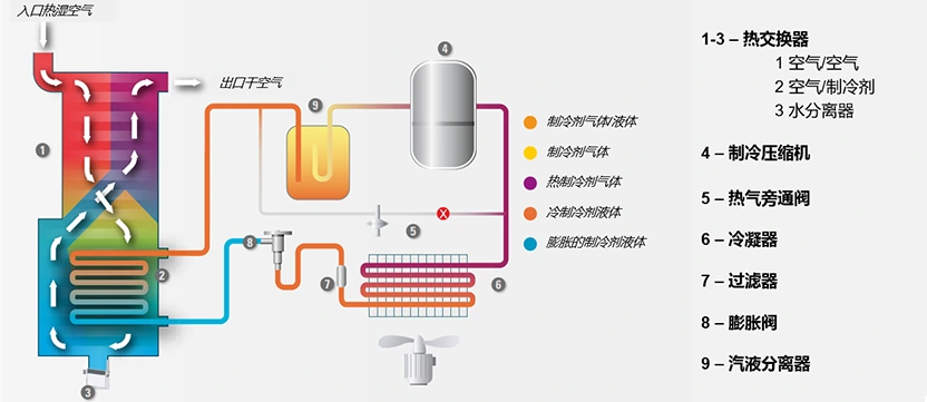 خشک کن هوای یخچالی نوع F اطلس کوپکو از یک مبدل حرارتی سه در یک استفاده می کند که جداکننده های هوا / هوا، هوا / مبرد و آب را با هم ترکیب می کند. این به طور موثر آب مایع جدا شده پس از خنک شدن را حذف می کند و هوای فشرده را از قبل خنک می کند و راندمان تبادل حرارت را بهبود می بخشد. به طور همزمان، هوای فشرده کمآب را تا دمای 10 درجه سانتیگراد کمتر از دمای ورودی گرم میکند و اطمینان میدهد که رطوبت نسبی هوای فشرده پس از تصفیه زیر 50 درصد است، از خوردگی جلوگیری میکند و به اثر کمآبی واقعی خشککن هوای یخچالی دست مییابد.