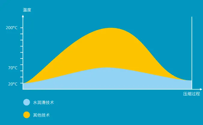 آب دارای قدرت خنک کنندگی عالی است و به طور موثر گرما را از منبع حذف می کند. اتلاف انرژی ناشی از تولید گرما حذف می شود و هوای فشرده بیشتری را می توان به ازای هر کیلووات انرژی تولید کرد. هوای فشرده خنک تر استرس حرارتی را بر قطعات کاهش می دهد و در نتیجه عمر مفید را افزایش می دهد.