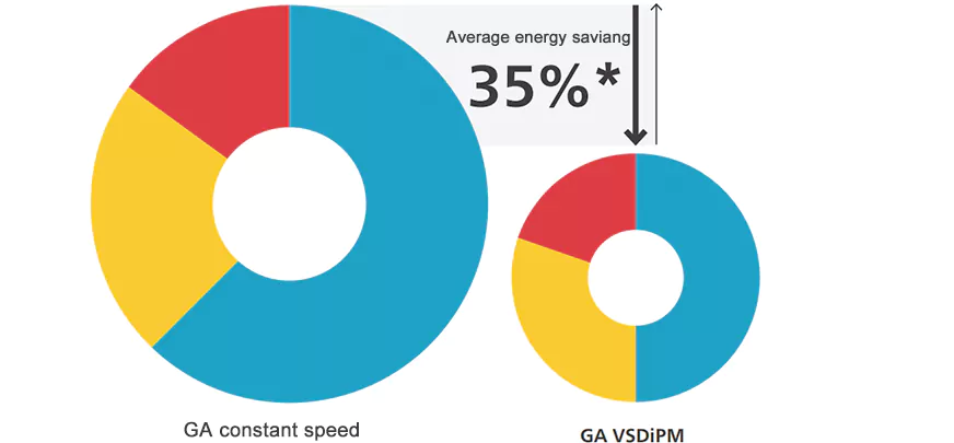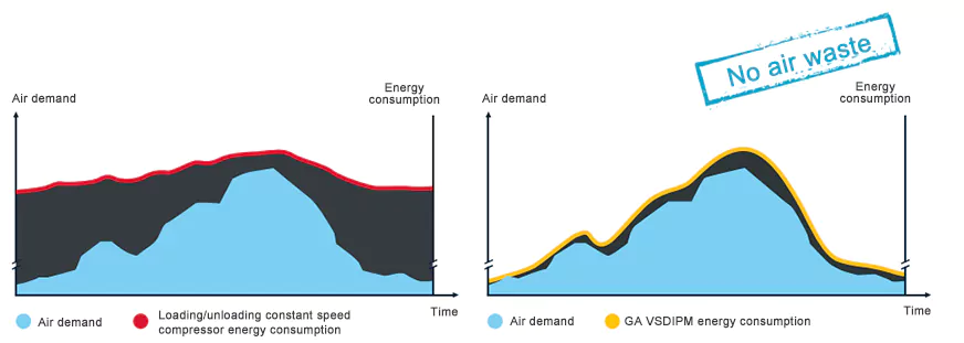 در مقایسه با ماشین های بارگیری/تخلیه سنتی، کمپرسور هوا با فرکانس متغیر VSD می تواند تا 35%* در انرژی صرفه جویی کند. علاوه بر این، موتور مغناطیس دائمی خنکشده با روغن GVSD میتواند تحت فشار کامل سیستم بدون تخلیه روشن و متوقف شود. همچنین تاثیر اوج جریان در هنگام راه اندازی را از بین می برد.